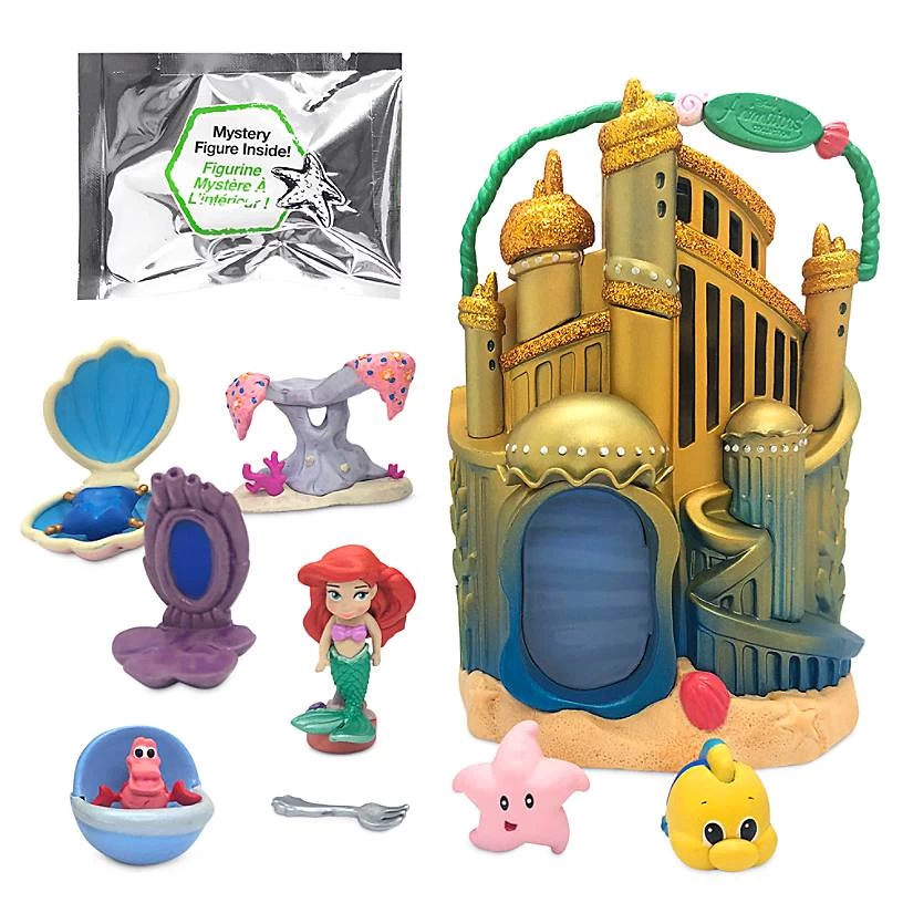 Pieces include: Palace, Ariel, Flounder, Sebastian in a bassinet, starfish, clamshell with cushion, dinglehopper, reef seat, shell vanity, and a mystery figure in a foil pouch