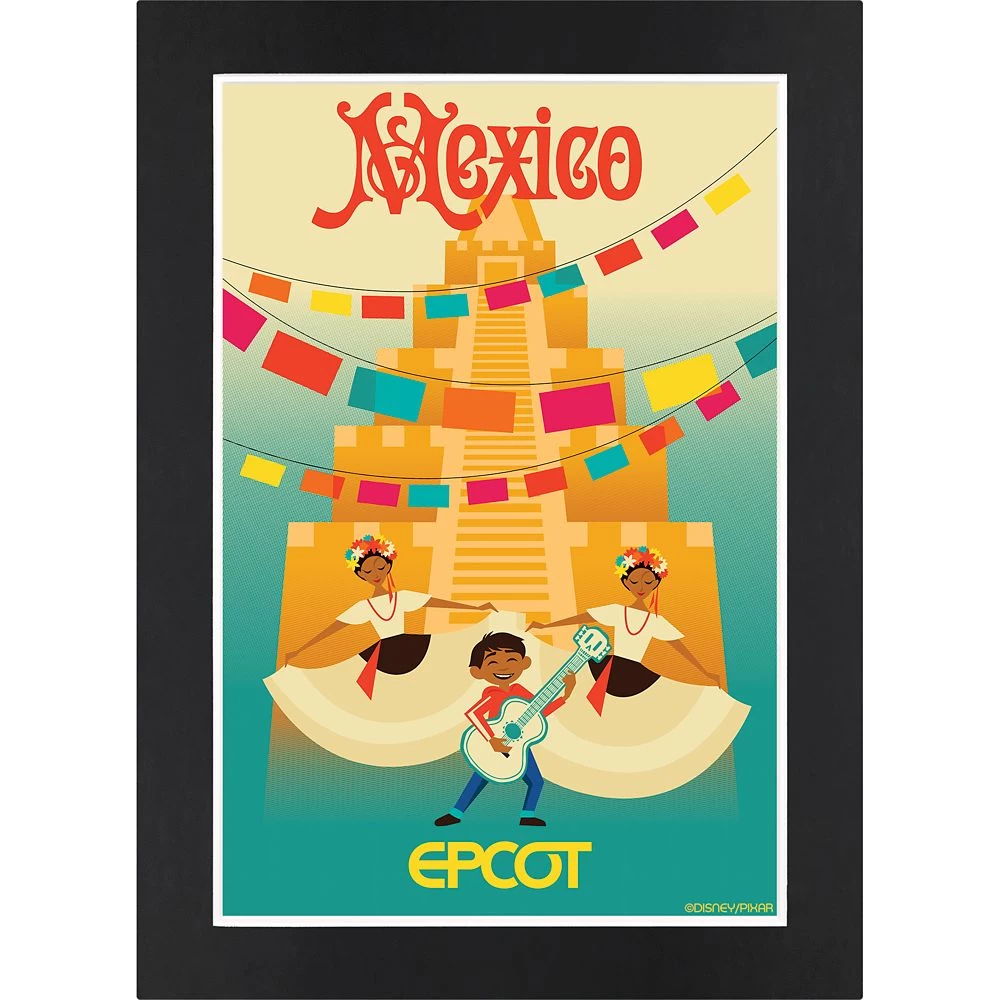 The Mexico Pavilion is a blend of the three major eras that have shaped the country—the pre-Columbian period, the Spanish-Colonial period and modern Mexico. Created by artist Stacey Aoyama, this print showcases the pavilion’s iconic Mesoamerican pyramid and Miguel, the lead character from the Disney and Pixar’s animated film set in Mexico, Coco. The characters of Coco help tell the story of DĂa de Muertos in the current gallery exhibit inside the pavilion.