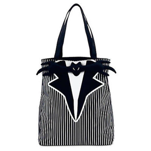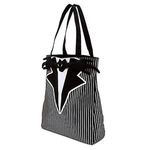 Disney Jack Skellington Tuxedo Tote Bag The Nightmare Before Christmas newCarry around the Pumpkin King on all your graveyard errands with our Jack Skellington Tuxedo Tote. Spacious enough for Christmas Town presents, this bag features an allover metallic pin-striped pattern with stuffed bat bowtie.Allover pin-striped patternTuxedo screen artStuffed bat bowtieInterior zippered pocketFully lined 100% cotton14 1/2” H x 15” W X 5” DStraps fall 9”