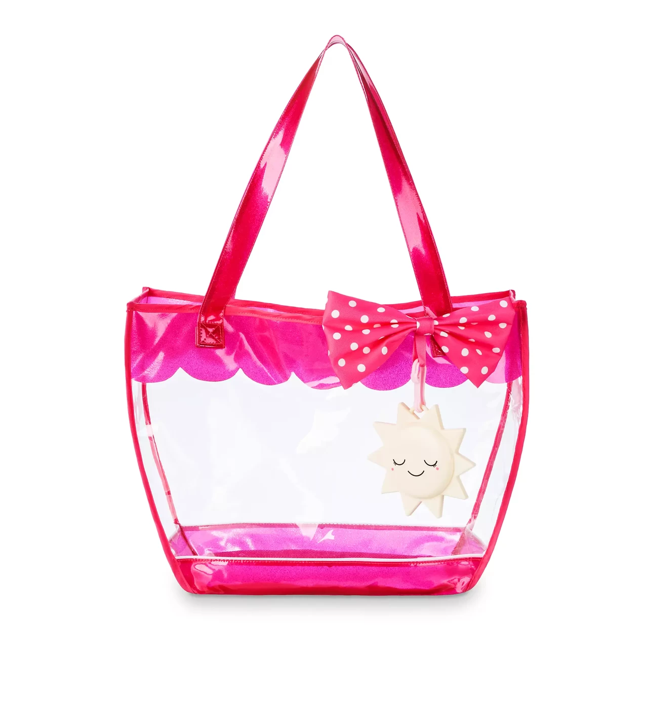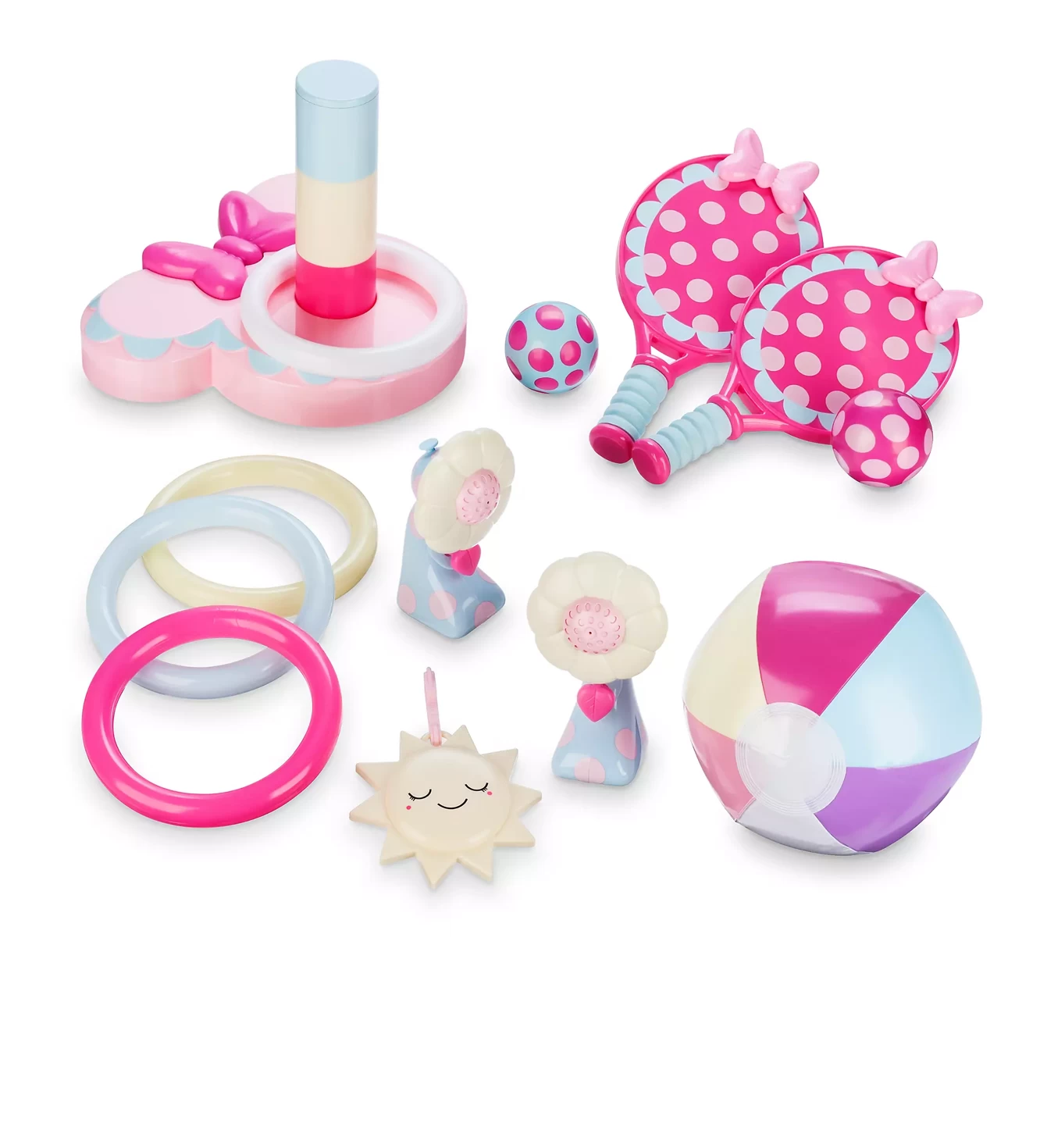 Includes: tote bag, 2 water sprayers, 1 inflatable ball, 2 paddles, 2 paddle balls, 1 ring toss base, 4 rings, 1 keyring