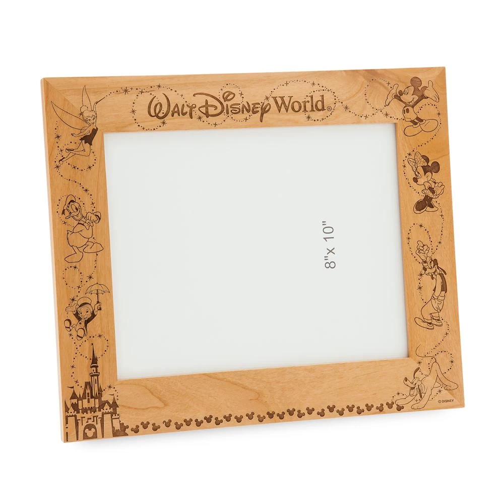Capture your precious family moments forever in this fanciful photo frame. Handcrafted by Arribas Brothers, the burnished wood frame, featuring Walt Disney World logo, Cinderella Castle, and classic characters from the Magic Kingdom, holds an 8” x 10” photograph displayed horizontally.